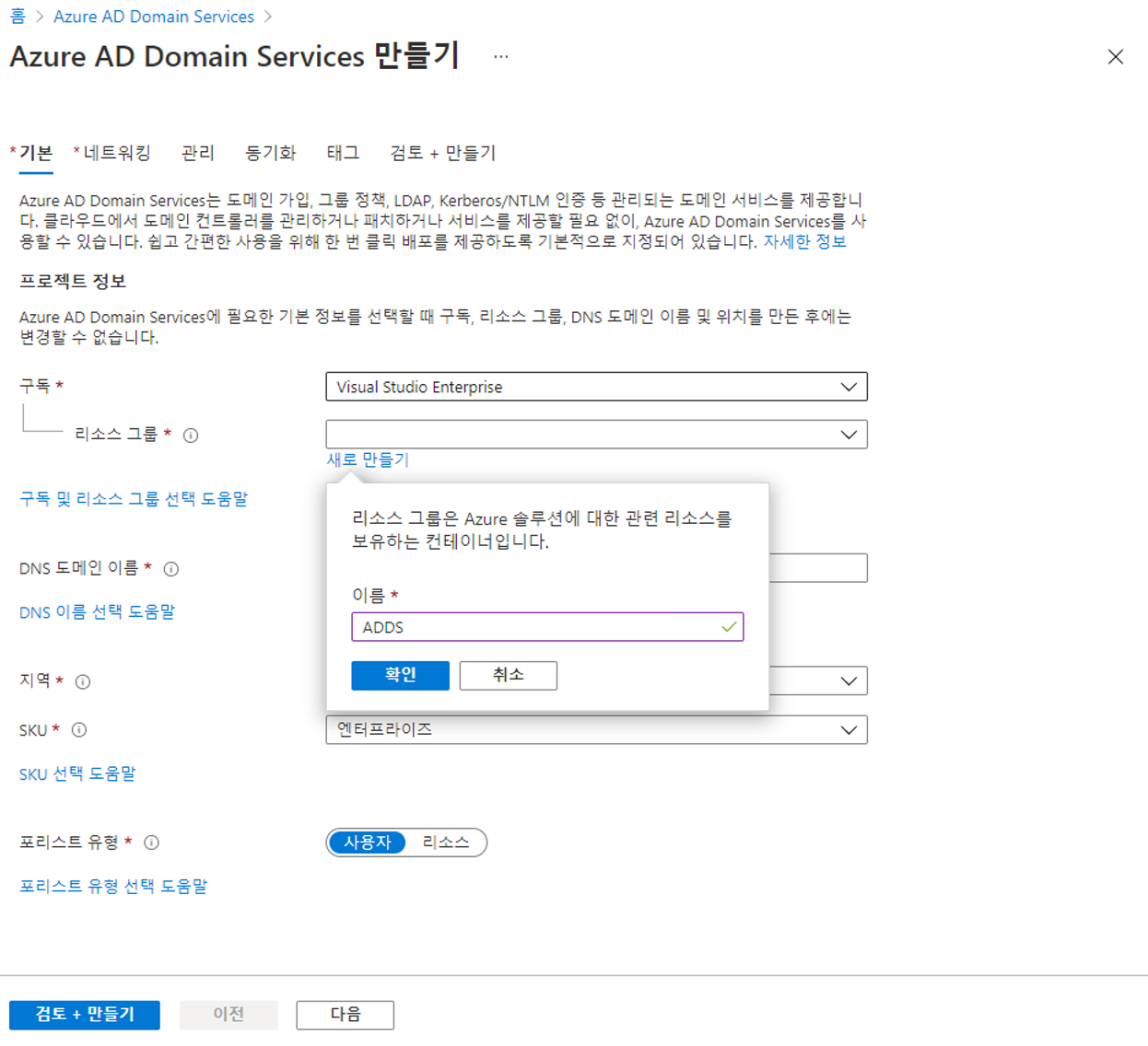리소스 그룹은 '새로 만들기'를 클릭하여 신규 생성합니다. 이름은 ADDS로 하겠습니다.