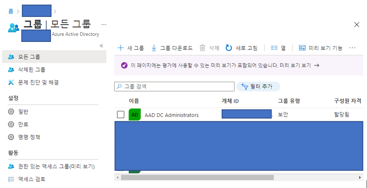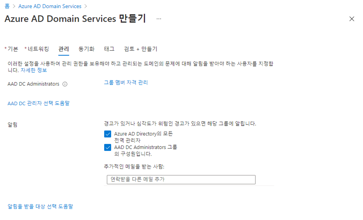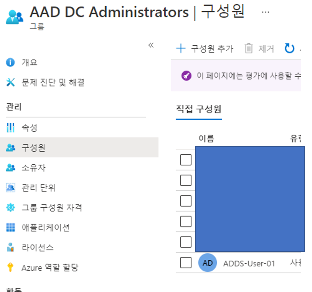 관리는 기본으로 넘어가겠습니다. AAD DC Administrators가 기본 그룹관리가 됩니다.