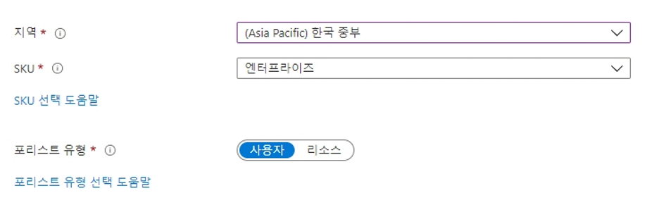 지역은 '(Asis Pacific) 한국 중부'로 선택하였습니다.