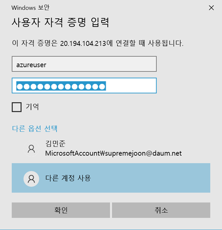 사용자 이름은 azureuser 그리고 비밀번호는 편하신 비밀번호를 사용해주세요.