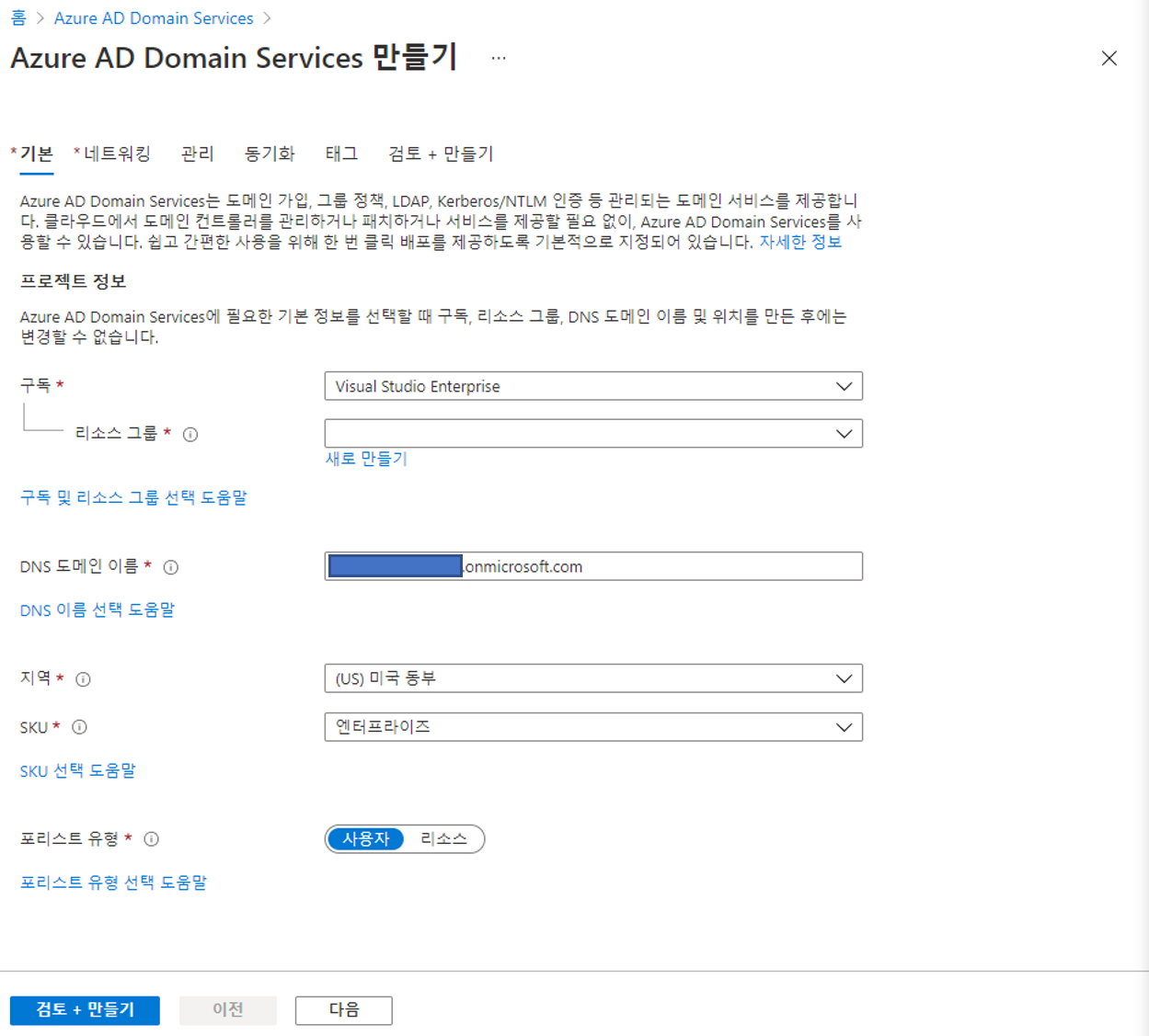 1. Azure AD Domain Services 생성