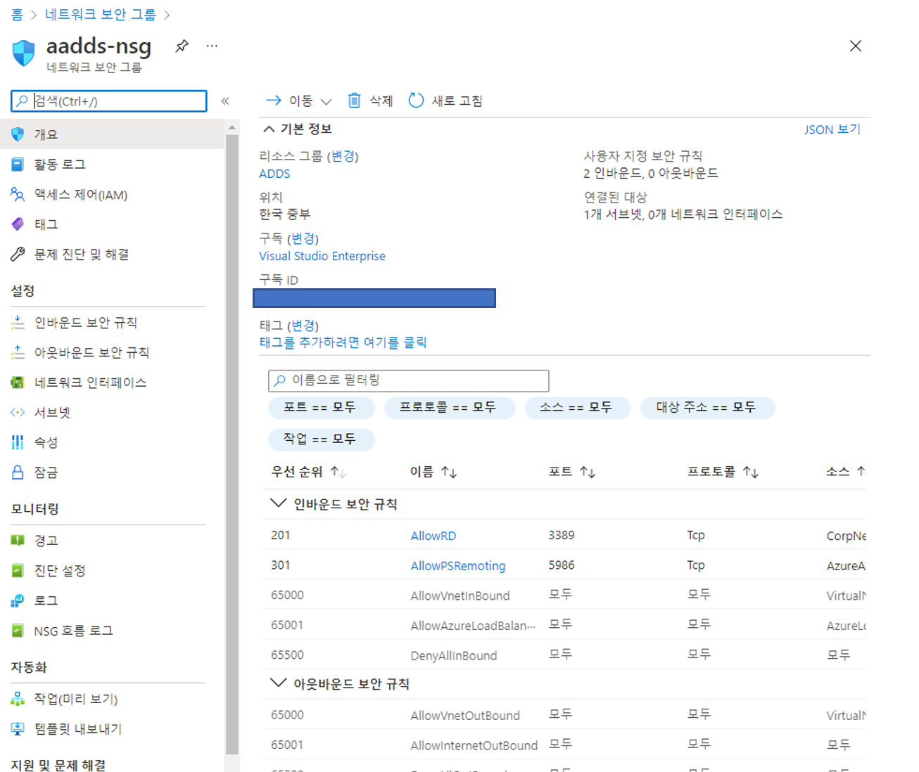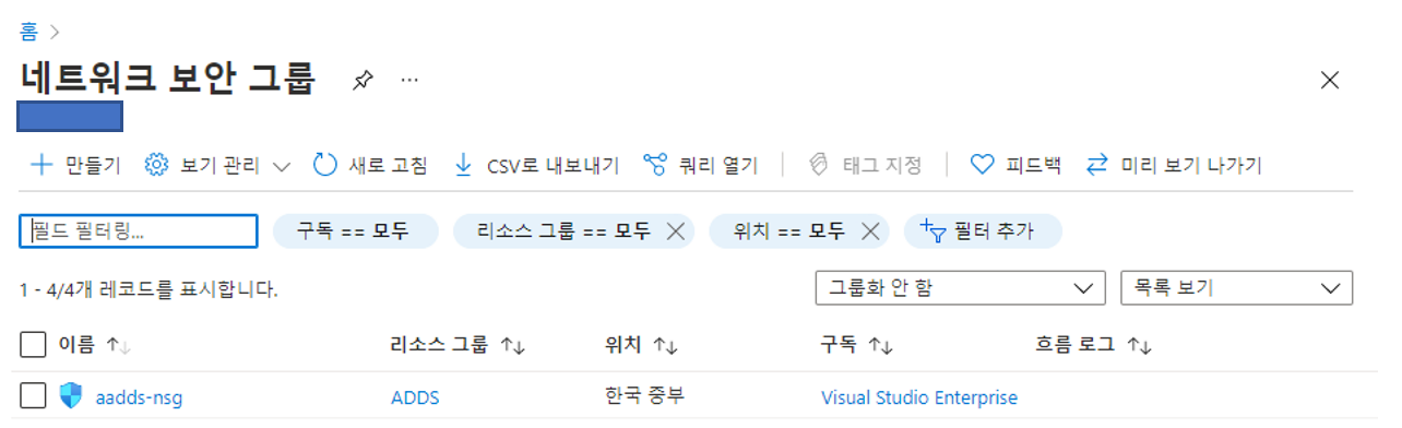 네트워크 보안 그룹에 aadds-nsg라는 네트워크 보안 그룹이 존재합니다.