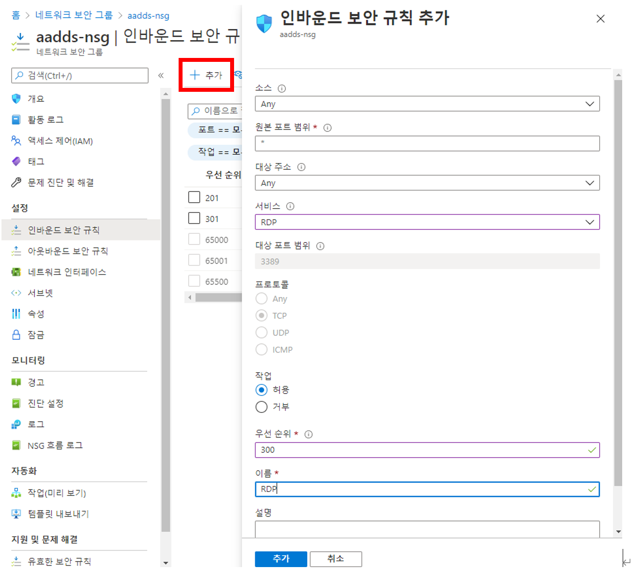 추가를 누르고 서비스에서 'RDP'로 선택하고 우선순위는 300으로 일단 넣어봅니다.