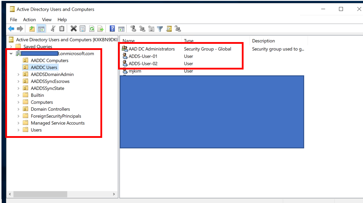 AADDC Users를 확인하면 유저 정보를 확인할 수 있습니다.