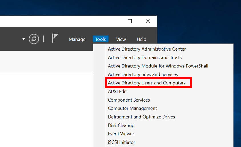 Tools > Active Directory Users and Computers를 클릭합니다.