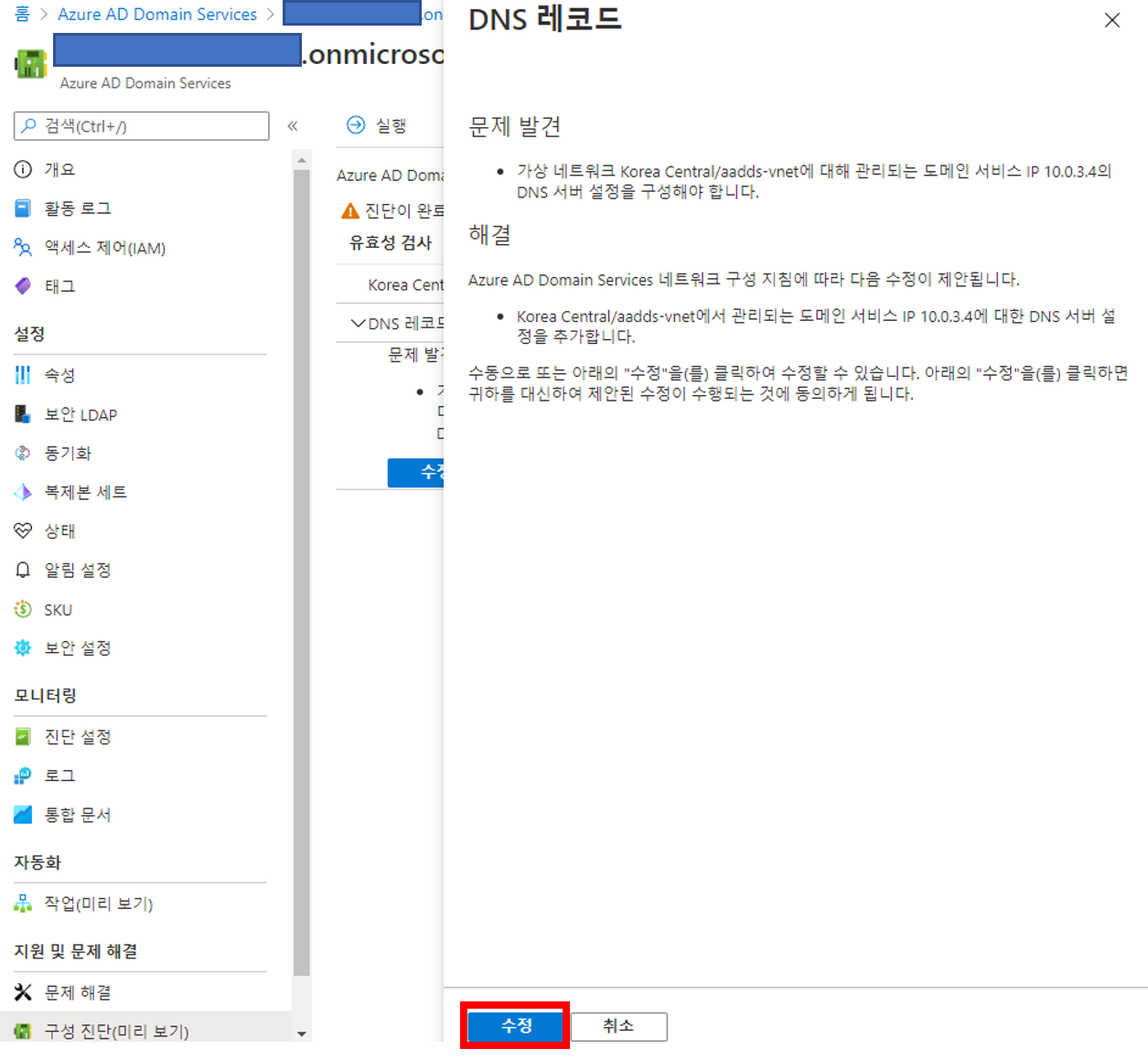 진단 내용에 따르면 도메인 서비스 IP가 DNS 서버 설정이 안 되어 있는 것으로 나오네요.