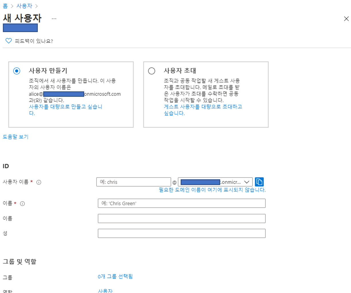 사용자 만들기에서는 '자신의 계정.onmicrosft.com' 으로 MS에서 기본 제공하는 도메인을 사용할 수 있습니다.