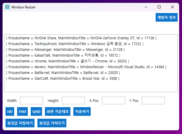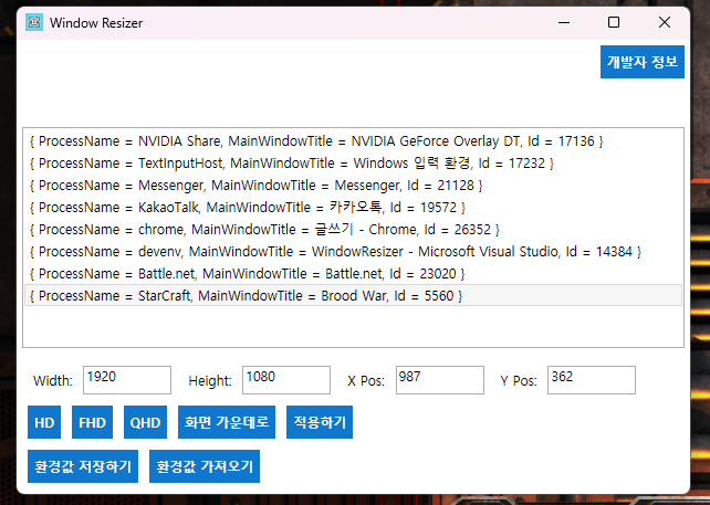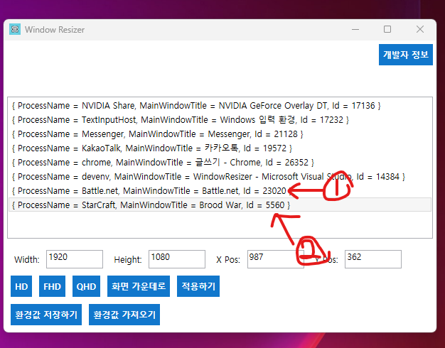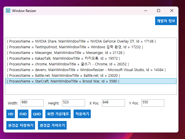 리스트에서 실행 중인 프로그램 중 스타크래프트를 클릭하면 현재 창의 크기와 위치가 숫자로 채워진다.