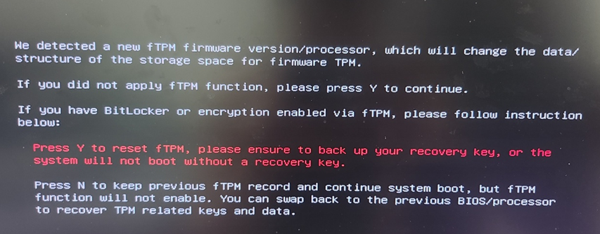Press N to keep previous TPM record and continue system boot, but if TPM function will not enable. You can swap back to the previous BIOS/processor to recover TPM related keys and data.