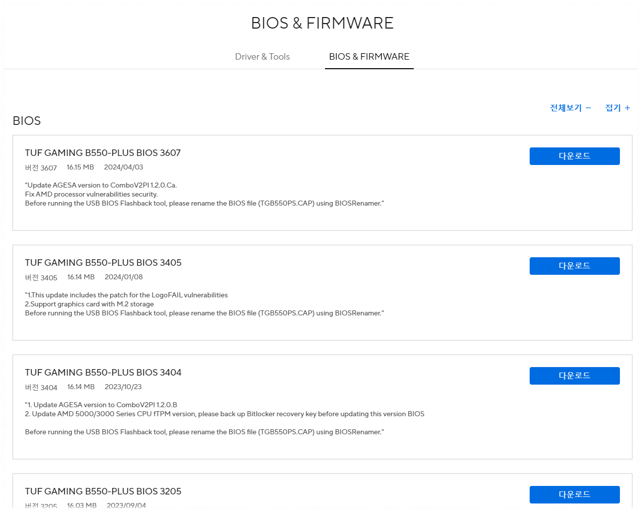 - 나는 바이오스 업데이트를 자주 하는 편이라 3405 버전이지만 최근 24년 4월 3일 기준으로 3607 버전이 업데이트가 존재하여 업데이트를 진행했다.