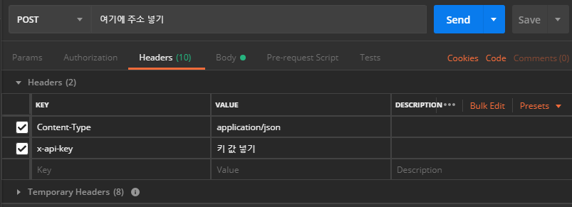 헤더값에는 x-api-key 값을 넣고..