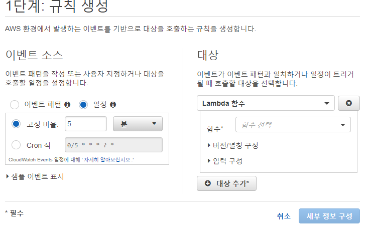 나는 일정으로 Cron식을 선택하여 매 20분마다 실행하도록 하였다. 그리고 대상 Lambda를 추가했다.