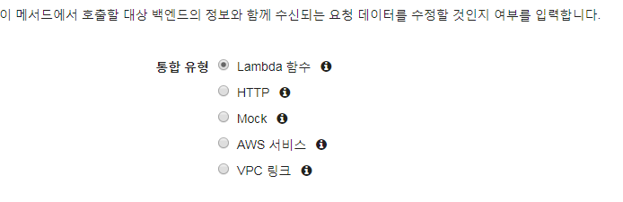 메서드 실행의 통합요청은 유형에 Lambda 를 체크하고, 매핑 템플릿은 json 으로 했다.