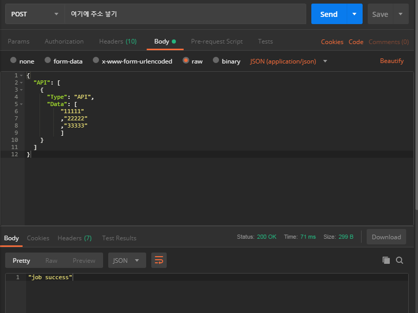 그리고 호출받는 Lambda 에서는 성공시 일단은 "job success" 라는 간단한 문구로 성공했음을 알리도록 했다.