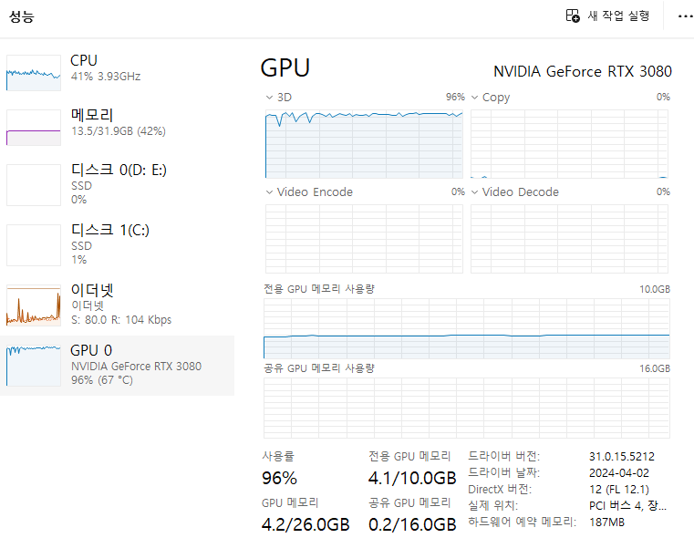 5700X3D는 CPU를 41% 사용하고 있는데 GPU를 96%까지 사용하는 것을 확인했다.