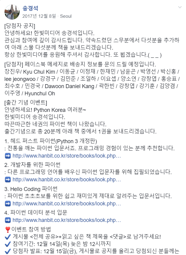 이 책은 2017년 12월중 한빛미디어의 송경석님 FB의 '파이썬 코리아' 그룹에서