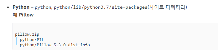 Python 의 경우는 위의 사진처럼 [폴더명/python/라이브러리] 의 구조로 만들어야 한다.