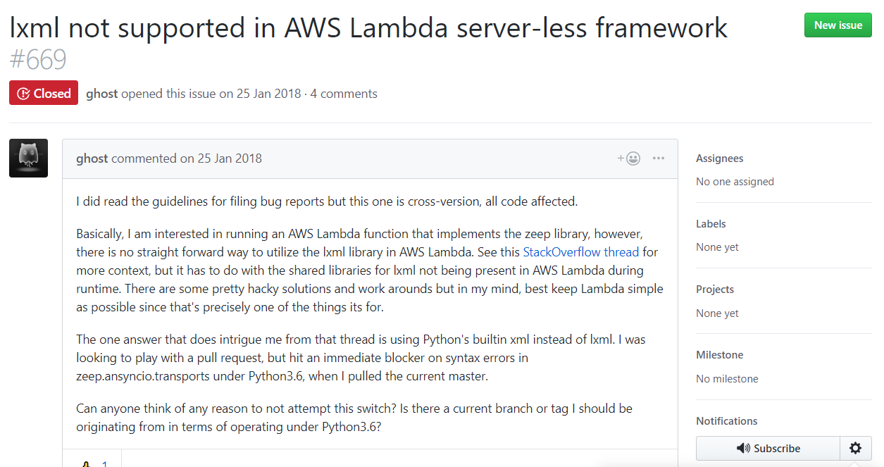 lxml 라이브러리를 사용하였을때 AWS Lambda 에서 동작이 불가능했다.